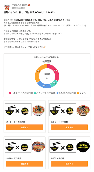 まだコミュニティを立ち上げてから2ヶ月程度と日が浅いので、商品化した事例はありませんが、開発者のモチベーションにつながっているなという実感はあります。先日、「好きな麺」のアンケートを取ったところ、多数の回答が集まり、1位は当社の商品にはない「平打のちぢれ麺」という結果が出ました。