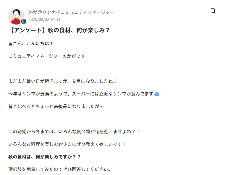 (↑旬の食材のテーマにしたコミュニティテーマを投稿)
