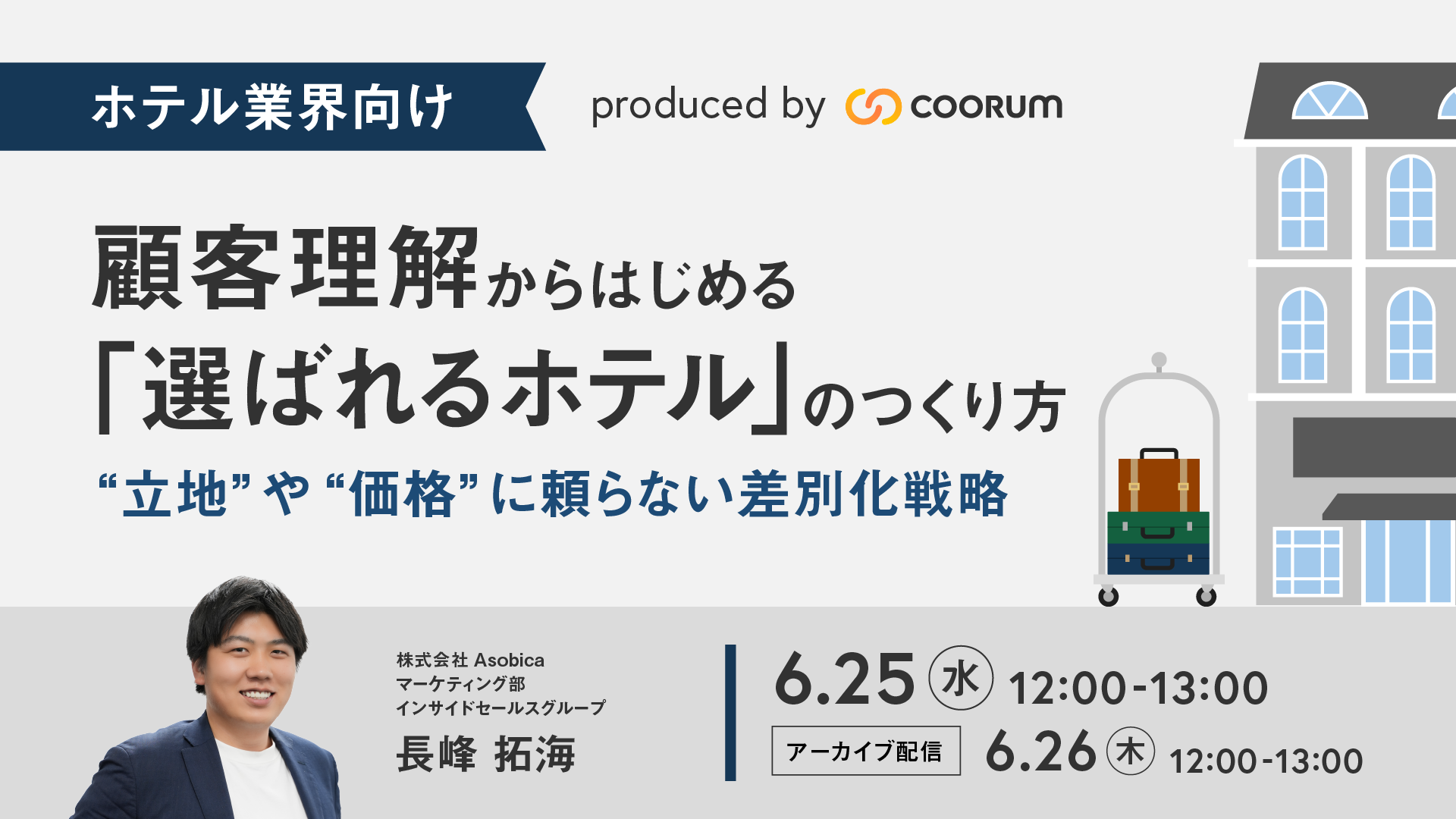 - 6月25日(水)12:00〜13:00 6月26日(木)12:00〜13:00 ※両日とも同じ内容で配信します。ご予定に合わせて参加ください。