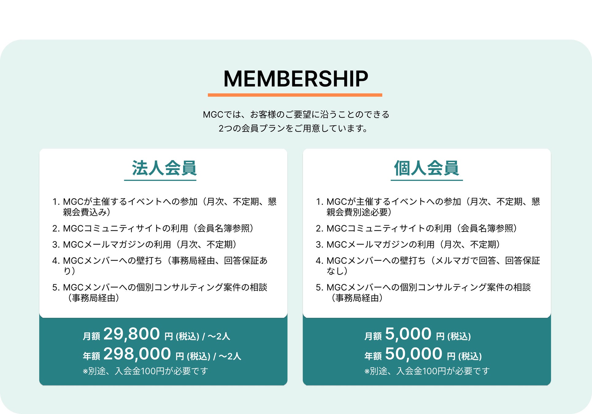 また、MGCでは、法人会員と個人会員があり、以下のような特典をご用意しています。