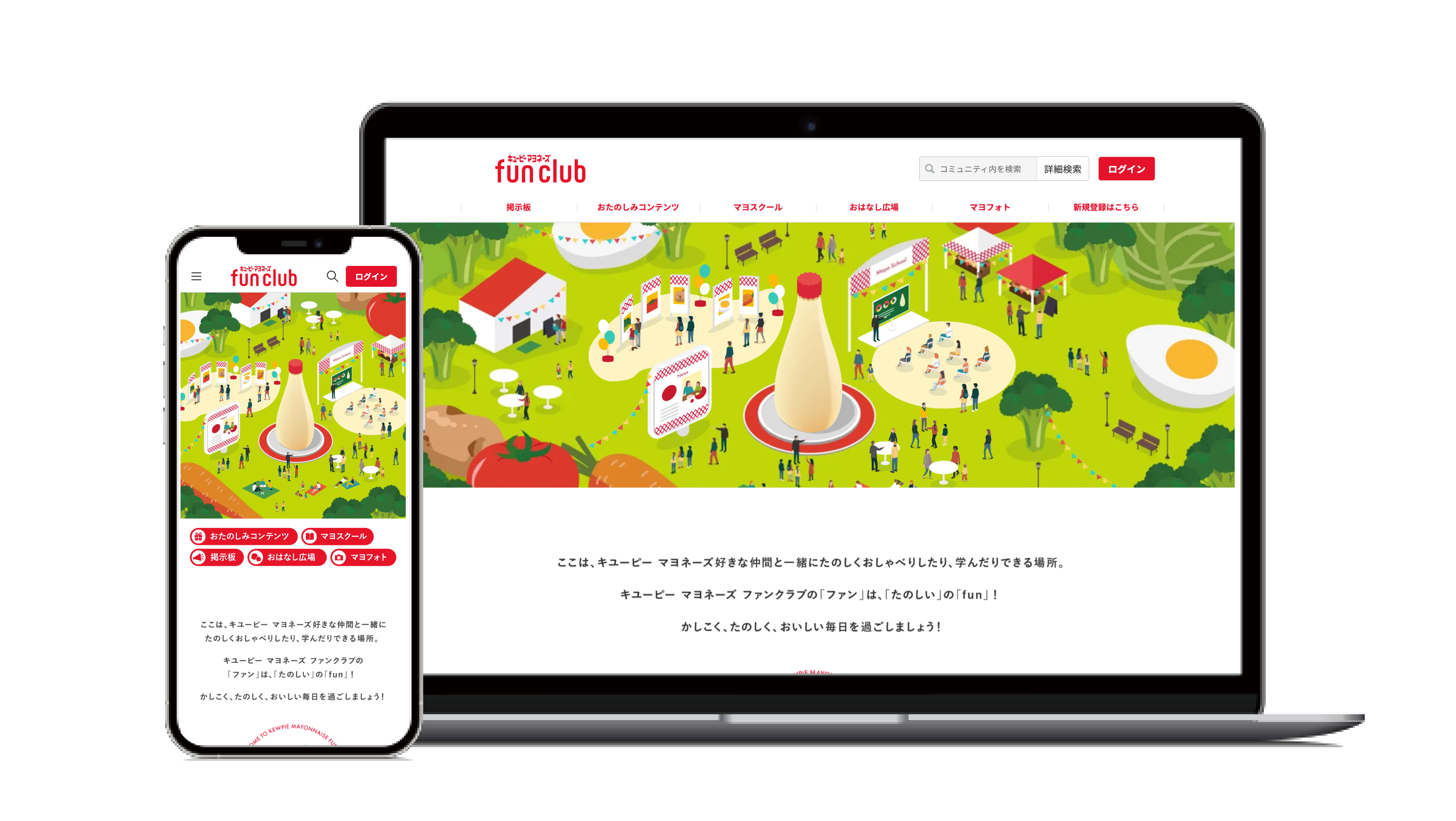 キユーピー マヨネーズ ファンクラブの「ファン」は「楽しい」の「fun」といった意味を込めています。リニューアルを通じて、キユーピー マヨネーズ ファンクラブは、キユーピー マヨネーズ好きの誰もが楽しめる場所を目指し、より良いコミュニティづくりに励んでいきます。